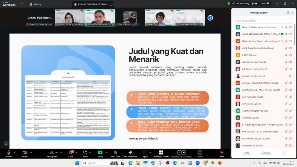 Kegiatan yang diinisiasi oleh Green Publisher ini diikuti oleh lebih dari 100 peserta dari berbagai perguruan tinggi di seluruh Indonesia. Webinar dilaksanakan secara daring (online) dan bertujuan memberikan wawasan mendalam serta strategi praktis bagi para dosen agar mampu sukses lolos hibah penelitian yang diselenggarakan oleh berbagai lembaga pendanaan nasional.